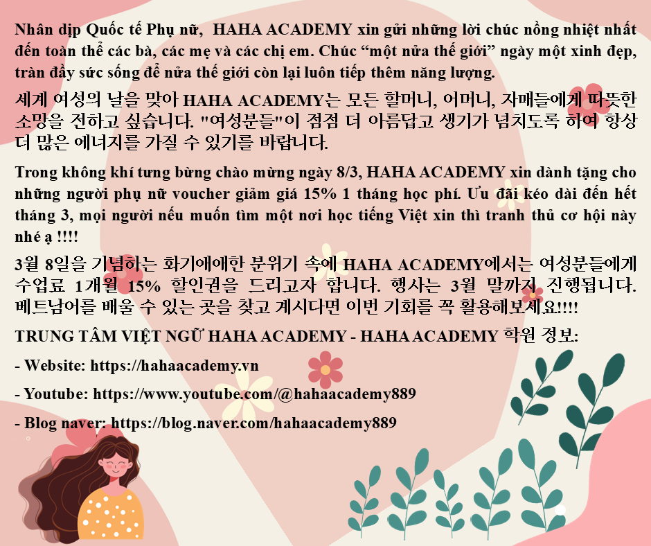 3월 8일을 기념하는 화기애애한 분위기 속에 HAHA ACADEMY에서는 여성분들에게 수업료 1개월 15% 할인권을 드리고자 합니다. 행사는 3월 말까지 진행됩니다. 베트남어를 배울 수 있는 곳을 찾고 계시다면 이번 기회를 꼭 활용해보세요!!!!